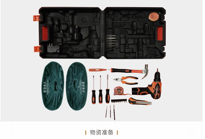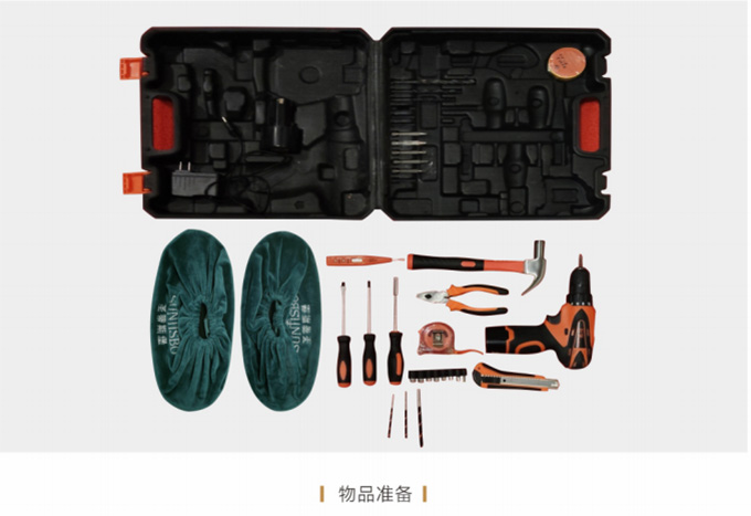 物资准备:上门前必须着圣蒂斯堡统一工作服,佩戴工作证,准备好安装工具、搬抬工具(搬运背带等)、备件、笔记本、手套、鞋套、地垫、卫生清扫工具(清洁剂、抹布、扫把簸箕、拖把、吸尘器等)、瓶装水、《圣蒂斯堡安装施工指示牌》、收据和圣蒂斯堡产品说明书、《产品配送单》和《配送满意度调查表》等物品。再带上小礼品,例:鲜花或碳包去味礼包等。